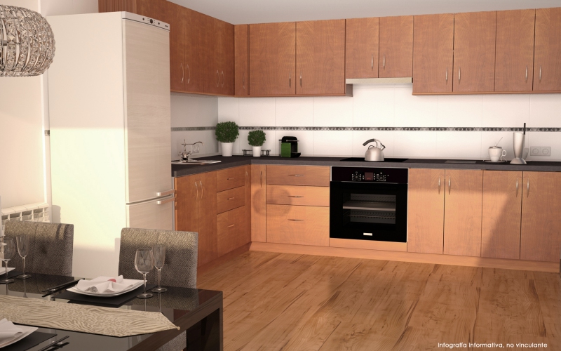 Las viviendas en cocina irán equipadas con amueblamiento de armarios altos y bajos en acabado color claro con elementos de cierre y ajuste silencioso.