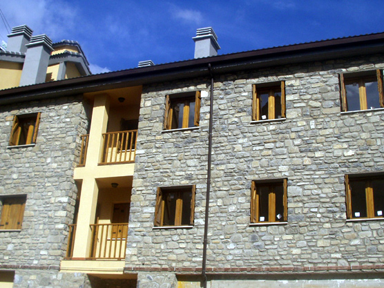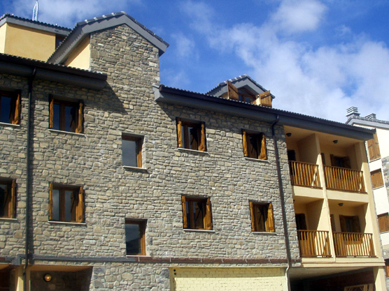 Fachada combinada de revestimiento mortero monocapa color trigo y piedra del país aparejada al modo tradicional.